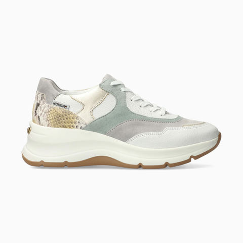 MEPHISTO HALBANE | Women's Sneakers. This sporty sneaker, with its flattering cut, offers a feminine and trendy look. The removable insole, incorporating SOFT-AIR Technology, and the SHOCK-ABSORBER in the outsole help minimize impact for a smooth and fatigue-free walk. AIR-RELAX Technology respects and preserves the foot's anatomy. The lacing system allows for quick and pressure-free closure, adapting perfectly to the foot's shape. The leather lining ensures healthy foot hygiene. This white women's model is made entirely of smooth grained leather with suede and reptile-print leather panels.